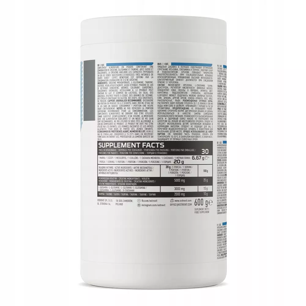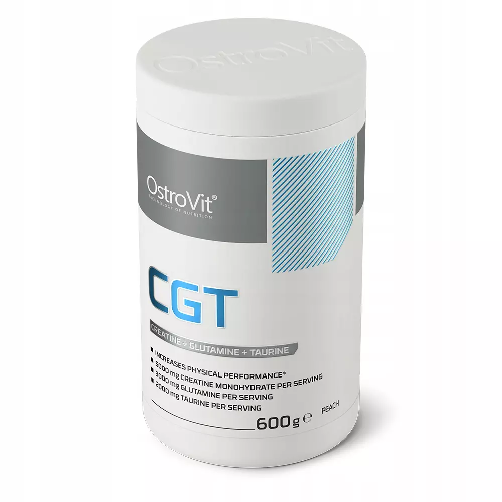 OstroVit CGT jest to genialny suplement diety w proszku, który zawiera trzy skuteczne składniki aktywne, jakimi są monohydrat kreatyny, glutamina oraz tauryna. Preparat to optymalne skupienie związków, które od lat panują zarówno wśród amatorów, jak i zawodowców sportów wytrzymałościowych oraz siłowych. Kreatyna to organiczny związek chemiczny występujący naturalnie w ludzkim organizmie. Jej korzystne działanie polega na prostym mechanizmie, który poprzez rozkład fosfokreatyny w mięśniach, uwalnia energię w postaci wysokoenergetycznych cząsteczek ATP. Kreatyna zawarta jest również w pożywieniu, ale aby porządnie nasycić nasze mięśnie kreatyną, jedyną drogą jest jej stała suplementacja. L-glutamina jest organicznym związkiem chemicznym z grupy aminokwasów endogennych. Charakteryzuje się wieloma funkcjami biologicznymi, jako transporter azotu czy prekursor syntezy glutationu i nukleotydów. Jest jednym z substratów w procesie glukoneogenezy. Tauryna znajduje się w mózgu, sercu, nerkach oraz w tkance mięśniowej. Pomimo jej niewielkiej ilości, odgrywa ona bardzo ważną rolę w prawidłowym funkcjonowaniu tych narządów. Pełni rolę neuroprzekaźnika w mózgu, stabilizatora błon komórkowych oraz ułatwia transport jonów.