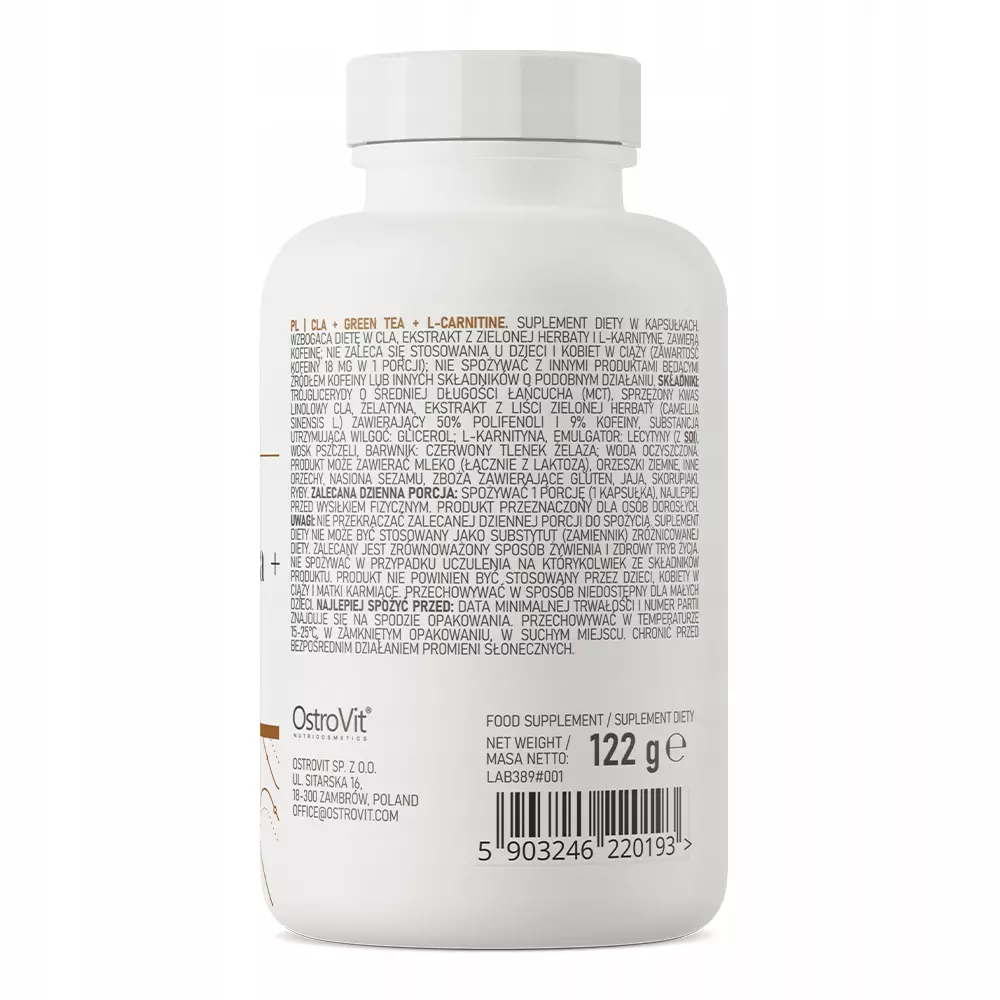 OstroVit CLA + Zielona Herbata + L-Karnityna to suplement diety w kapsułkach skierowany do osób aktywnych fizycznie, zawierając sprzężony kwas linolowy (CLA), ekstrakt z liści zielonej herbaty oraz L-karnitynę.