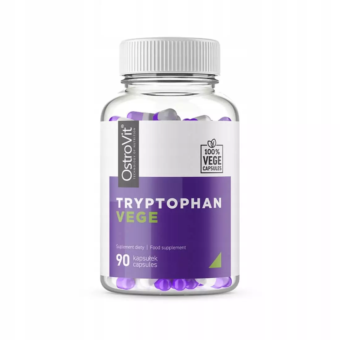 OstroVit Tryptofan VEGE to suplement diety oparty o aminokwas, jakim jest L-tryptofan. Produkt powstał w innowacyjnej linii produktów OstroVit 100% VEGE CAPSULES, który jest dedykowany weganom oraz wegetarianom. Produkt powstał bez dodatku żadnych substancji oraz związków odzwierzęcych.