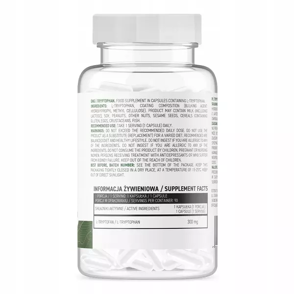 300 mg L-tryptofanu w jednej kapsułce 90 porcji w opakowaniu 1 porcja = 1 kapsułka HPMC Tryptofan