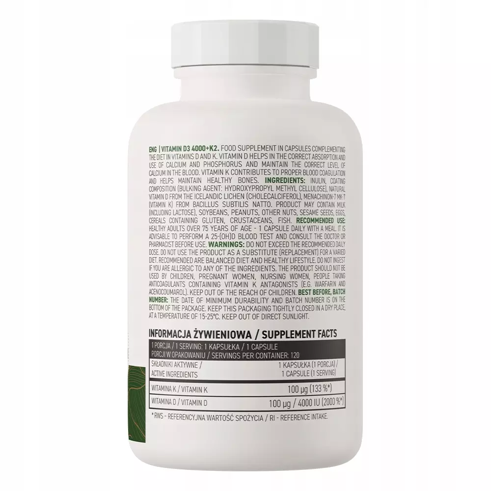 OstroVit Witamina D3 4000 IU + K2 to wysokiej jakości suplement diety, który stanowi źródło witaminy D3 oraz witaminy K2, w najlepiej przyswajalnej przez ludzki organizm formie menachinonu-7-MK-7. To wegański preparat dostępny w formie łatwych do połknięcia kapsułek, stworzony z myślą o seniorach po 75 roku życia oraz osobach, które wyróżniają się zwiększonym zapotrzebowaniem na cenne mikroskładniki.