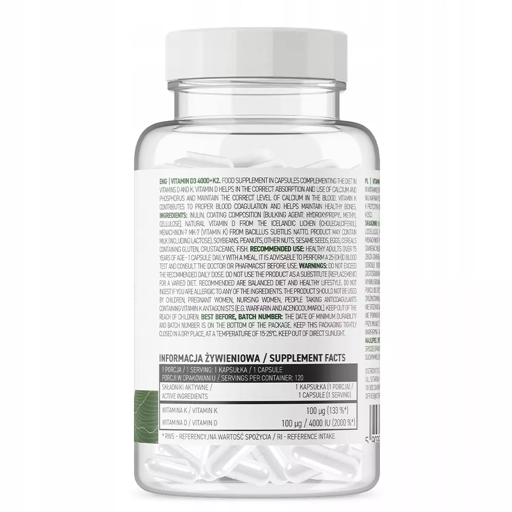 - Źródło witaminy D3 oraz K2 - jedna porcja suplementu diety zawiera 4000 IU cholekalcyferolu oraz 100 μg menachinonu-7-MK-7.