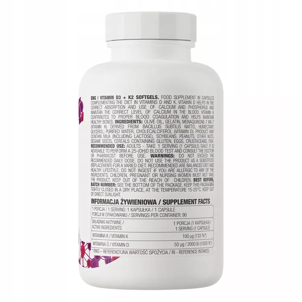 - Składniki aktywne: Zawiera 2000 IU witaminy D i 100 µg witaminy K2 MK-7.