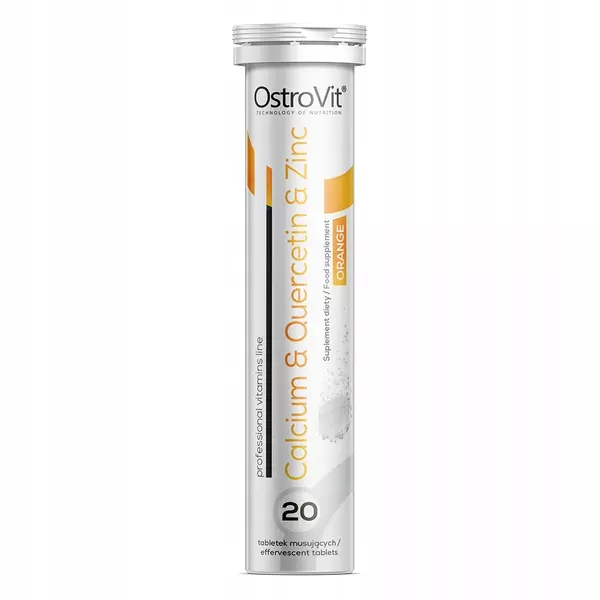 OstroVit Wapń & Kwercetyna & Cynk to suplement diety w formie tabletek musujących, który stanowi zestaw trzech różnych składników aktywnych. Produkt został stworzony z myślą o osobach, które chcą uzupełnić dietę o wapń, kwercetynę i cynk, a które nie przepadają za suplementacją w formie tabletek doustnych. Wystarczy rozpuścić tabletkę w wodzie i przyjąć gotowy płyn o pysznym, pomarańczowym smaku.
