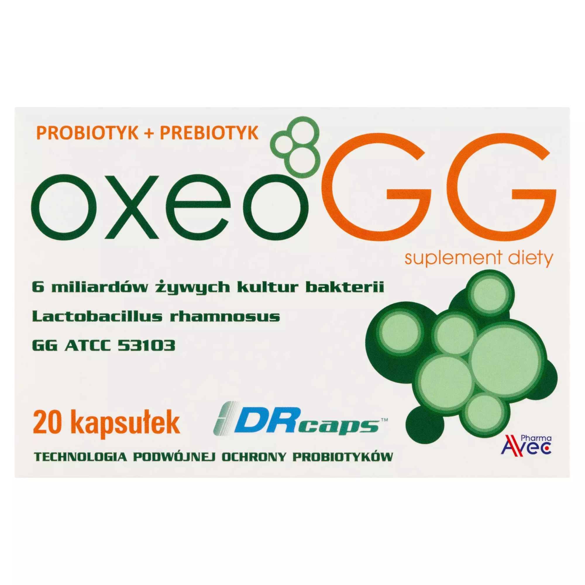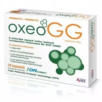 Oxeo GG – suplement diety w postaci kapsułek zawierający 6 miliardów żywych kolonii bakterii Lactobacillus rhamonosus GG w połączeniu z prebiotykiem. Produkt przeznaczony dla osób dorosłych.