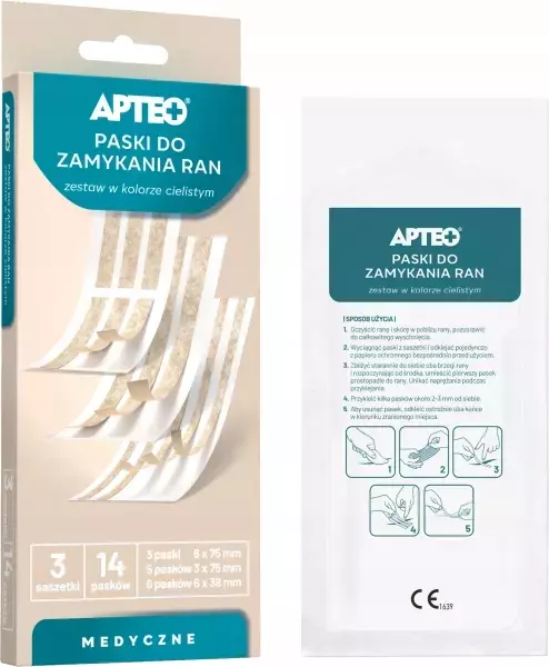 Właściwości pasków do zamykania ran APTEO hipoalergiczny klej, w kolorze skóry, wytrzymałe i elastyczne, łatwe w użyciu, dobrze przylegają do skóry, nieinwazyjne zamykanie drobnych ran I cięć, sterylne. Sposób użycia Oczyścić ranę i skórę w pobliżu rany, pozostawić do całkowitego wyschnięcia.
