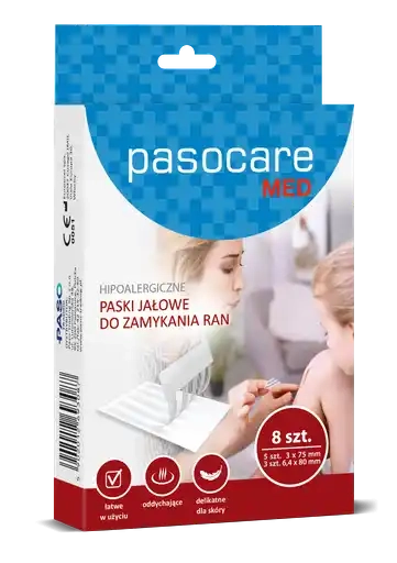 Pasocare MED Paski jałowe do zamykania ran - 8 sztuk Pasocare MED to wysokiej jakości jałowe paski hipoalergiczne, przeznaczone do zamykania ran. Zestaw zawiera 8 plastrów w dwóch różnych rozmiarach - 5 sztuk o wymiarach 3 mm x 75 mm oraz 3 sztuki o wymiarach 6,4 x 80 mm. Nasze paski jałowe są specjalnie zaprojektowane, aby zbliżać krawędzie ran do siebie i zapobiegać ich otwieraniu się w trakcie naturalnego procesu gojenia. Wykonane z miękkiej włókniny, są delikatne dla skóry i zapewniają jej naturalną wentylację. Ten wyrób medyczny posiada oznakowanie CE0051 oraz deklarację zgodności UE, co świadczy o jego wysokiej jakości i zgodności z unijnymi standardami. Każde opakowanie zawiera wygodną etykietę i instrukcję w języku polskim, umożliwiającą łatwe i bezpieczne korzystanie z produktu. Dane techniczne: - EAN (GTIN): 5902012693087 - Kod producenta: 5902012693087 - Producent: Paso Trading - Model: PasocareMED - Stan: Nowy - Waga produktu z opakowaniem jednostkowym: 0.1 - Sterylność: jałowe - Liczba sztuk w opakowaniu: 8