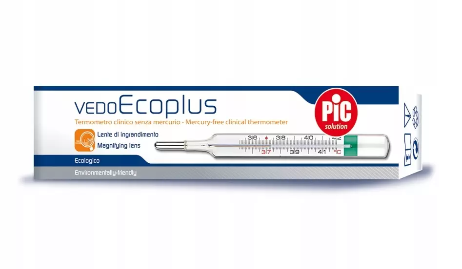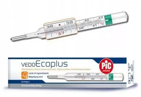 Termometr bezrtęciowy PIC VedoEcoplus Tradycyjny, szklany termometr bezrtęciowy z podziałką. Zawiera stop metali, który zachowuje ciekłą postać.