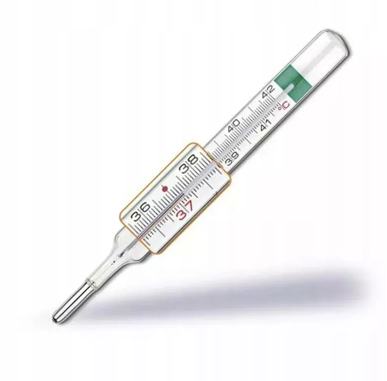 Termometr lekarski Tradycyjny pomiar Czytelna podziałka Wypełniony nietoksycznym stopem metali: galu, indu i cyny Zakres pomiaru: 35,5°C - 42°C (dokładność -0,15/+0,1°C) Czas trwania pomiaru: co najmniej 4 min, pod pachą/oralnie/rektalnie Przezroczysty plastikowy futerał z bardzo dużym szkłem powiększającym Przyrząd ułatwiający strząśnięcie termometru w celu zbicia temperatury To jest wyrób medyczny. Używaj go zgodnie z instrukcją używania lub etykietą.