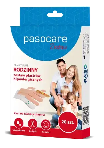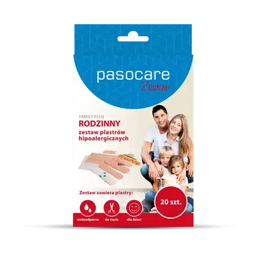 Zestaw plastrów PASOCARE Family Plus to idealny zestaw dla całej rodziny. Plastry Family Plus posiadają właściwości hipoalergiczne, nie powodują uczuleń. Są odporne na wilgoć oraz oddychają przez mikroperforeacje. Plastry są elastyczne, dopasowują się do kształtu ciała. Opakowanie zawiera 20 sztuk plastrów.