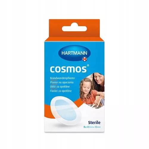 Wyrób medyczny Hartmann Cosmos oparzenia to sterylne, hydrożelowe plastry do zaopatrywania oparzeń pierwszego i drugiego stopnia. Wspomagają proces gojenia rany oraz przyjemnie chłodzą i nawilżają miejsce oparzenia. Plastry uśmierzają ból oraz zapewniają dyskrecję. Plastry chronią ranę przed bakteriami. Plastry są wodoodporne i umożliwiają swobodną kąpiel. Sterylne plastry na oparzenia zawierają wilgotny żel. Wytwarzają środowisko wilgotne i jednocześnie pochłaniają wysięk z rany.