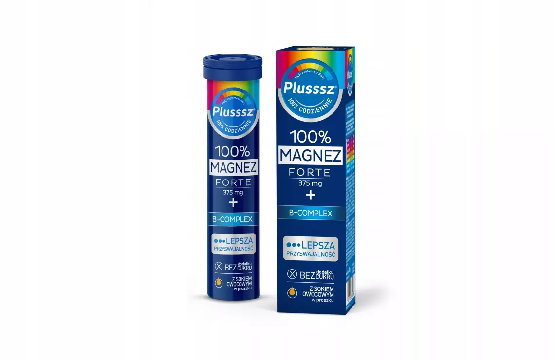 Plusssz 100% Magnez Forte + B-complex - suplement diety zawierający w swoim składzie magnez oraz 5 najważniejszych witamin z grupy B. Produkt przeznaczony dla osób dorosłych.