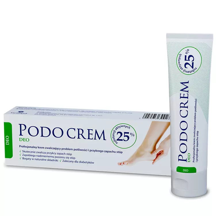 PODOCREM 25% DEO to profesjonalny krem przeznaczony do pielęgnacji stóp, zwalczający problem nadmiernej potliwości oraz nieprzyjemnego zapachu. Dzięki zawartości 25% substancji aktywnych, krem posiada silne właściwości dezodoryzujące i odświeżające, jednocześnie pielęgnując i wygładzając skórę stóp. Produkt jest zalecany również dla diabetyków.