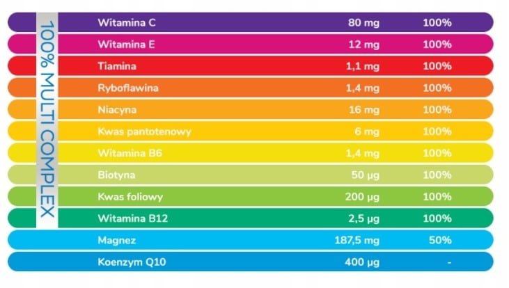 regulatory kwasowości: kwas cytrynowy, węglany sodu; węglan magnezu; substancja wypełniająca: sorbitole; witaminy (kwas L-askorbinowy, amid kwasu nikotynowego, octan DL-alfatokoferylu, D-pantotenian wapnia, chlorowodorek pirydoksyny, ryboflawina, monoazotan tiaminy, kwas pteroilomonoglutaminowy, D-biotyna, cyjanokobalamina); aromaty; koncentrat soku buraka czerwonego w proszku; substancje słodzące: cyklaminiany, sacharyny; substancje przeciwzbrylające: poliwinylopirolidon, glikol polietylenowy; sok pomarańczowy w proszku – 0,1%; sok mango w proszku – 0,1%; koenzym Q10.