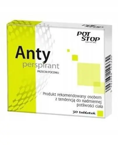 Pot Stop Antyperspirant - suplement diety zawierający zestaw wysokiej jakości witaminowo-roślinnych składników dla osób z tendencją do nadmiernej potliwości ciala. Produkt polecany dla osób dorosłych.