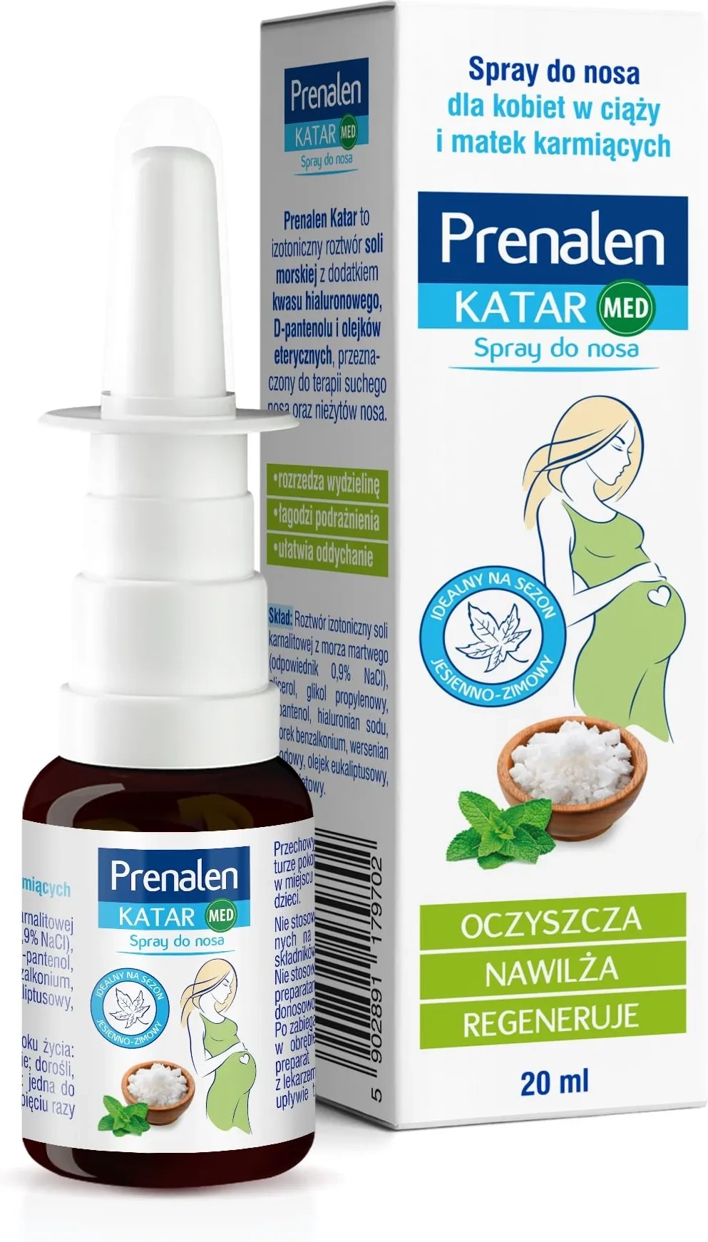 Prenalen Katar Med jest izotonicznym roztworem soli morskiej z dodatkiem kwasu hialuronowego, D-pantenolu oraz olejków eterycznych :