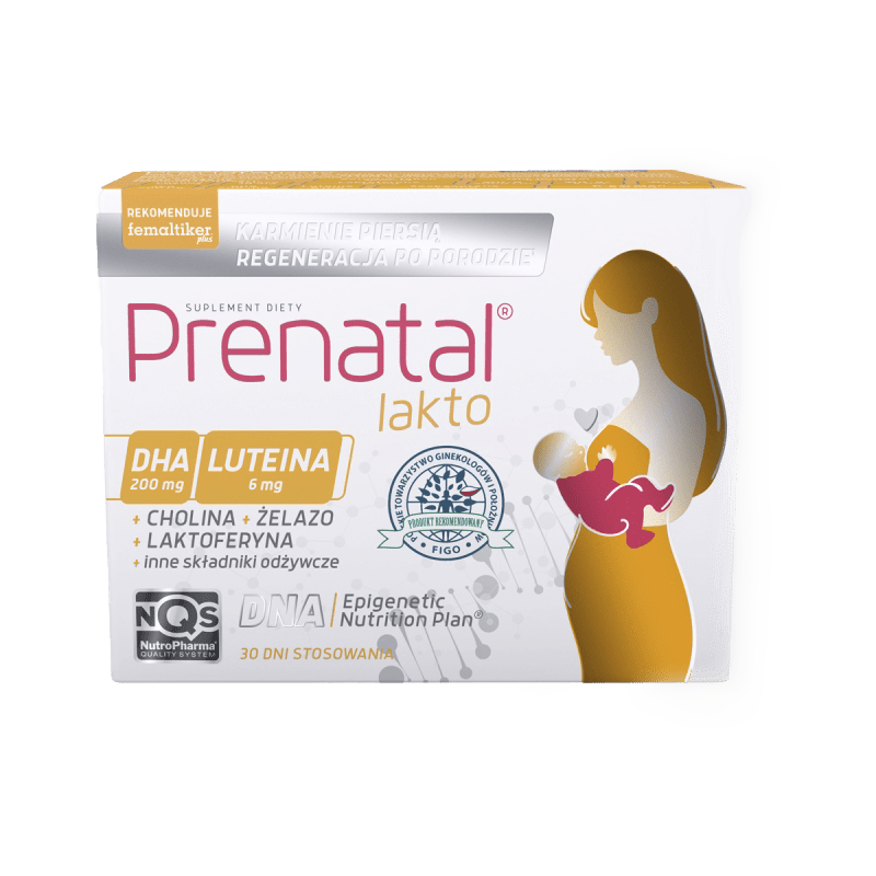 Wskazania i właściwości: Prenatal® lakto jest szczególnie polecany kobietom karmiącym piersią. Zawiera m.in. DHA (kwas dokozaheksaenowy), luteinę, cholinę oraz kompleks niezbędnych składników, wyselekcjonowanych pod względem korzystnego wpływu na matkę i dziecko, w tym jedynie aktywny folian w porcji rekomendowanej przez PTGiP.