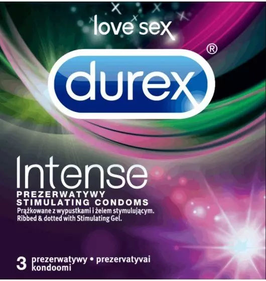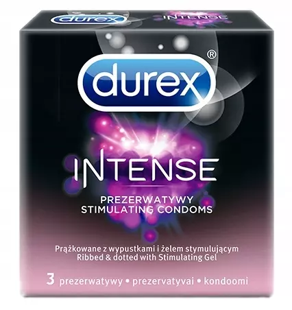 Durex Intense to pierwsze prezerwatywy* które poprawiają doznania seksualne obojga partnerów ułatwiając jej osiągnąć orgazm i dając jemu większą satysfakcję. Przeźroczyste, nawilżane prezerwatywy lateksowe, prążkowane z wypustkami, pokryte żelem stymulującym Desirex. Korzyści dla obojga partnerów! Dla niej: Prążki i wypustki oraz żel stymulujący dają różnorodność doznań od rozgrzewania, przez chłodzenie do mrowienia, co zwiększa intensywność orgazmów. Dla niego: Satysfakcja z dawania przyjemności partnerce, dodatkowo kształt Easy-On zapewnia większy komfort zakładania i lepsze dopasowanie prezerwatywy. Dzięki Durex Intense każdy mężczyzna może zapewnić swoje partnerce niesamowite orgazmy!