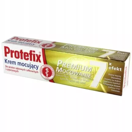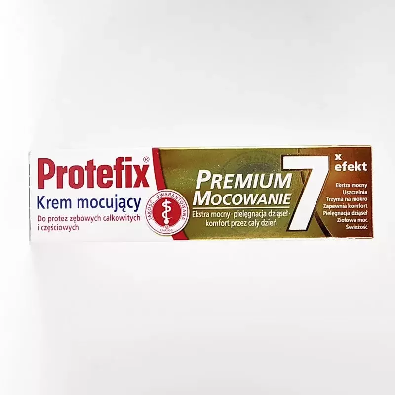 Protefix® Krem mocujący PREMIUM MOCOWANIE 7 x efekt! EKSTRA MOCNY - pielęgnacja dziąseł - komfort przez cały dzień 1. Ekstra mocny: mocuje natychmiast zapewniając komfort przez cały dzień 2. Skuteczne uszczelnianie: protezy zębowej przed przedostaniem się drobinek jedzenia 3. Trzyma na mokro: można nanosić na mokrą protezę zębową dzięki elastycznej warstwie między dziąsłami a protezą zębową 4. Dlugotrwafy komfort: dzięki elastycznej warstwie między dziąsłami a protezą zębową 5. Pielęgnacja dziąseł: ochronne działanie witaminy E 6. Ziołowa moc: dzięki formule z mirrą, szałwią i rumiankiem 7. Łagodna świeżość: przyjemnie łagodny i świeży smak mięty