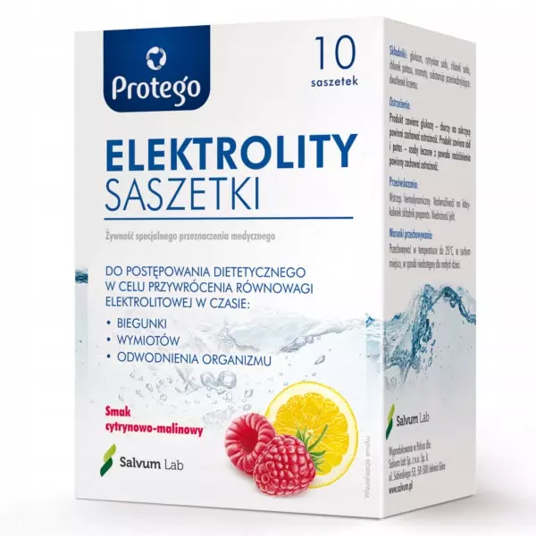 Protego Elektrolity Saszetki to połączenie glukozy i elektrolitów przeznaczone do przygotowania płynu nawadniającego o obniżonej osmolarności 245 mOsm/l. Produkt należy stosować w celu uzupełnienia płynów i składników mineralnych w przypadku zaburzeń równowagi wodno-elektrolitowej, które mogą wystąpić w organizmie, zwłaszcza podczas biegunki lub wymiotów
