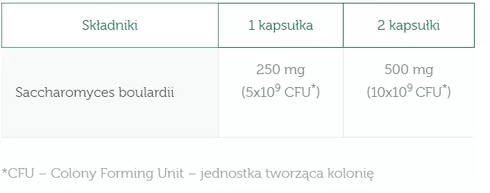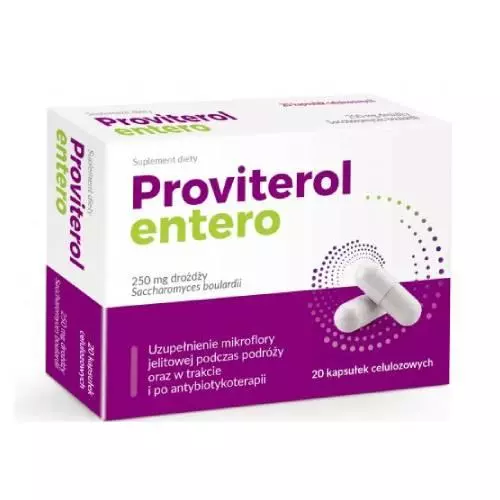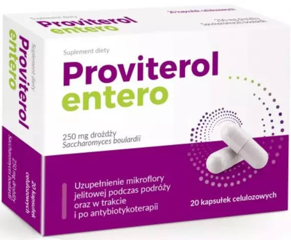 Suplement diety Proviterol ENTERO to suplement diety w formie kapsułek, zawierający żywe kultury drożdży Saccharomyces boulardii. Jedna kapsułka to aż 250 mg drożdży Saccharomyces boulardii (5 mld żywych kultur drożdży). Dla dzieci powyżej 3 roku życia Wskazania: Proviterol ENTERO to suplement diety w formie kapsułek, zawierający żywe kultury drożdży Saccharomyces boulardii. Produkt zaleca się stosować w trakcie i po antybiotykoterapii oraz podczas podróży, w celu uzupełnienia mikroflory jelitowej. Zalecana dzienna porcja do spożycia: dzieci powyżej 3. roku życia – 1 kapsułka dorośli – 1-2 kapsułki. Sposób spożycia: Kapsułkę należy połknąć i popić niewielką ilością wody. Nie należy popijać gorącymi lub mrożonymi płynami. W przypadku stosowania produktu u dzieci, kapsułkę należy otworzyć, a jej zawartość rozprowadzić w wodzie i podać do spożycia bezpośrednio po przygotowaniu. Ostrzeżenia: Nie należy przekraczać zalecanej porcji w ciągu dnia. Nie należy stosować w przypadku nadwrażliwości na którykolwiek ze składników preparatu. Suplement diety nie może być stosowany jako substytut (zamiennik) zróżnicowanej diety. Składniki: drożdże Saccharomyces boulardii; fruktoza, laktoza, kapsułka (substancja wiążąca: hydroksypropylometyloceluloza); substancja przeciwzbrylająca – sole magnezowe kwasów tłuszczowych; barwnik – węglan wapnia. Składniki 1 kapsułka 2 kapsułki Saccharomyces boulardii 250 mg (5x109 CFU*) 500 mg (10x109 CFU*) *CFU – Colony Forming Unit – jednostka tworząca kolonię Masa netto: 20 kapsułek Suplementy diety nie mogą być stosowane jako substytut (zamiennik) zróżnicowanej diety ani zdrowego trybu życia. Nie należy przekraczać zalecanej porcji produktu do spożycia w ciągu dnia. Suplementy diety powinny być przechowywane w sposób niedostępny dla małych dzieci. Przed zastosowaniem produktu sugerujemy zapoznanie się z dokładnymi informacjami podanymi na opakowaniu lub załączonej ulotce. Warunki przechowywania: Przechowywać w szczelnym opakowaniu. W suchym i chłodnym miejscu, w sposób niedostępny dla dzieci. Chronić przed światłem. Producent: Salvum LAB K.Kowaleczko, A.Lewandowski, D.Lewandowski, S.Zawadzki Sp. k. ul. Jana Sobieskiego 53, 58-500 Jelenia Góra