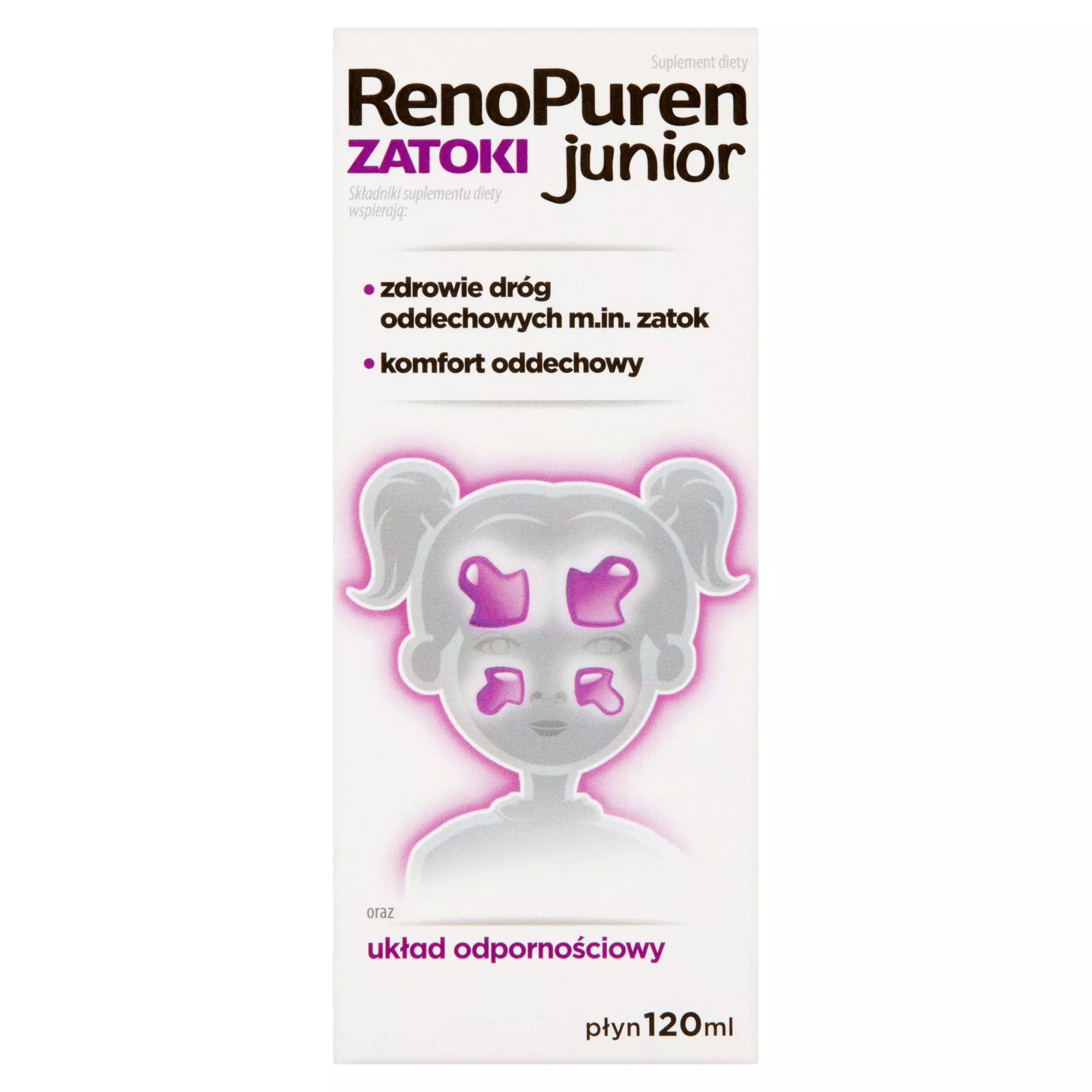 RenoPuren Zatoki Junior to suplement diety stworzony dla dzieci powyżej 3-go roku życia. Składniki suplementu diety RenoPuren Zatoki Junior wspomagają funkcjonowanie górnych dróg oddechowych, do których należą zatoki przynosowe, jama nosowa i gardło, wspierają komfort oddechowy, a także wspierają odporność.