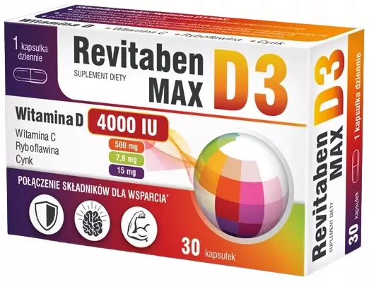 Revitaben D3 MAX to korzystne połączenie witamin i minerałów w jednej kapsułce. Zawiera dawkę 4000 jednostek witaminy D3, wzbogacone o 500 mg witaminy C, 15 mg cynku oraz 2,8 mg witaminy B2 - ryboflawiny.