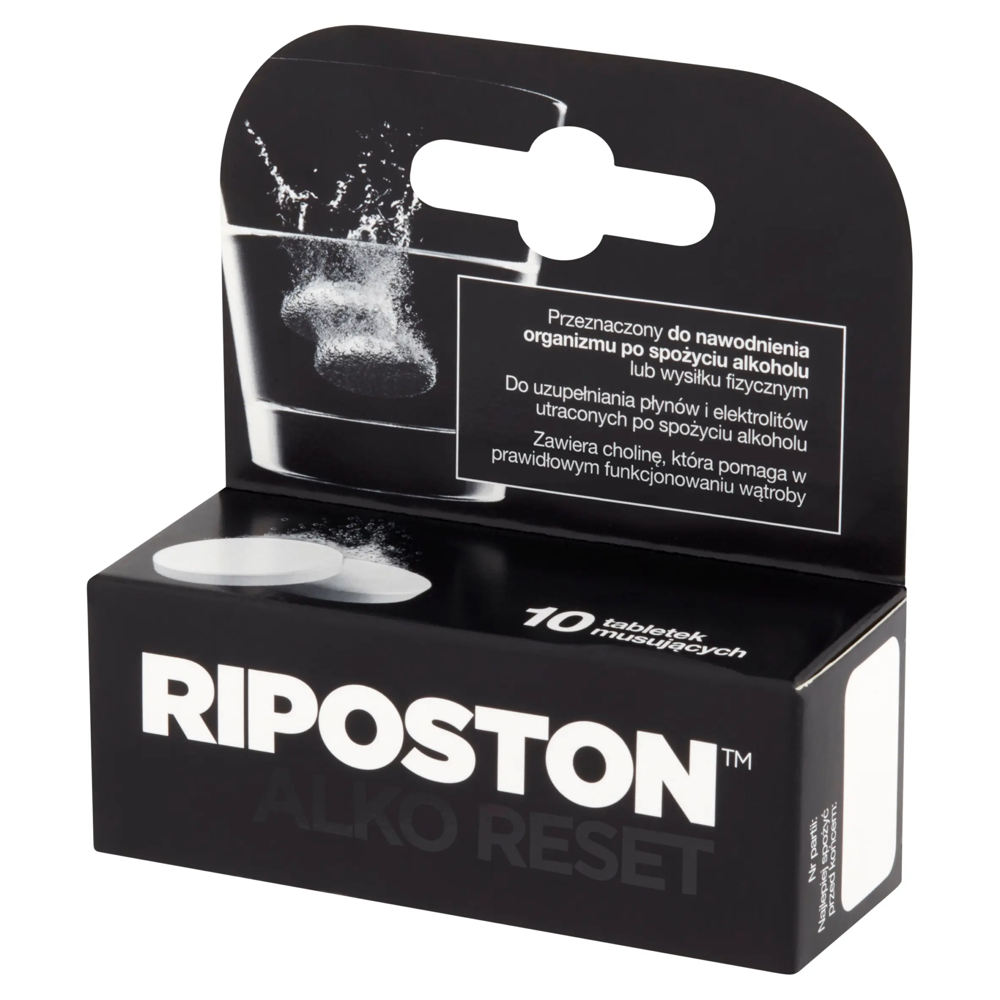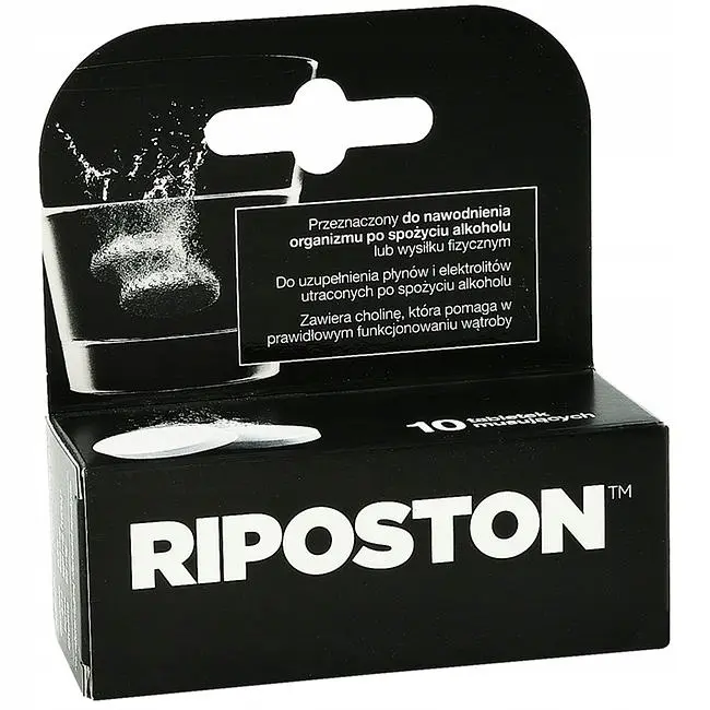 Riposton to tabletki musujące do sporządzania roztworu nawadniającego organizm po spożyciu alkoholu lub wysiłku fizycznym. Przeznaczony jest dla osób dorosłych do uzupełnienia utraconych płynów i składników mineralnych. Dodatkowo produkt został wzbogacony o cholinę, która pomaga w prawidłowym funkcjonowaniu wątroby.