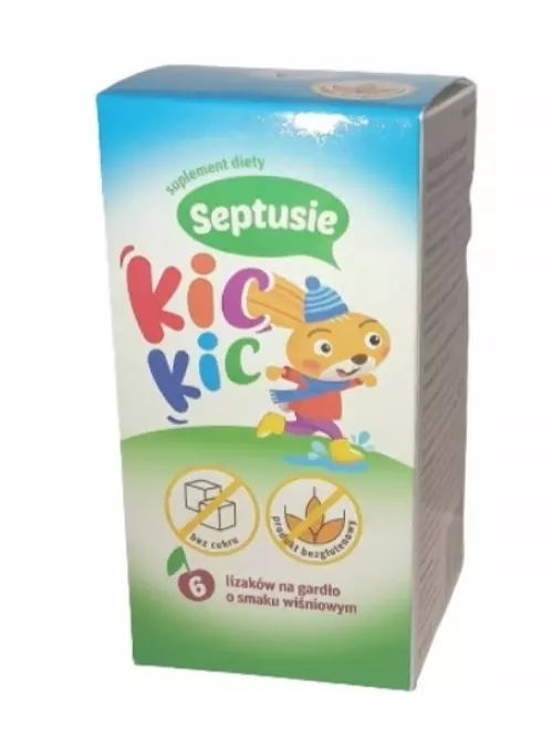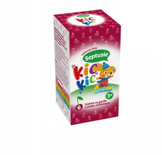 Septusie Kic Kic lizaki na gardło to suplement diety dla dzieci powyżej 3. roku życia o smaku wiśniowym, zawierający witaminę C oraz wyciągi z porostu islandzkiego, lipy, prawoślazu, i czarnego bzu.