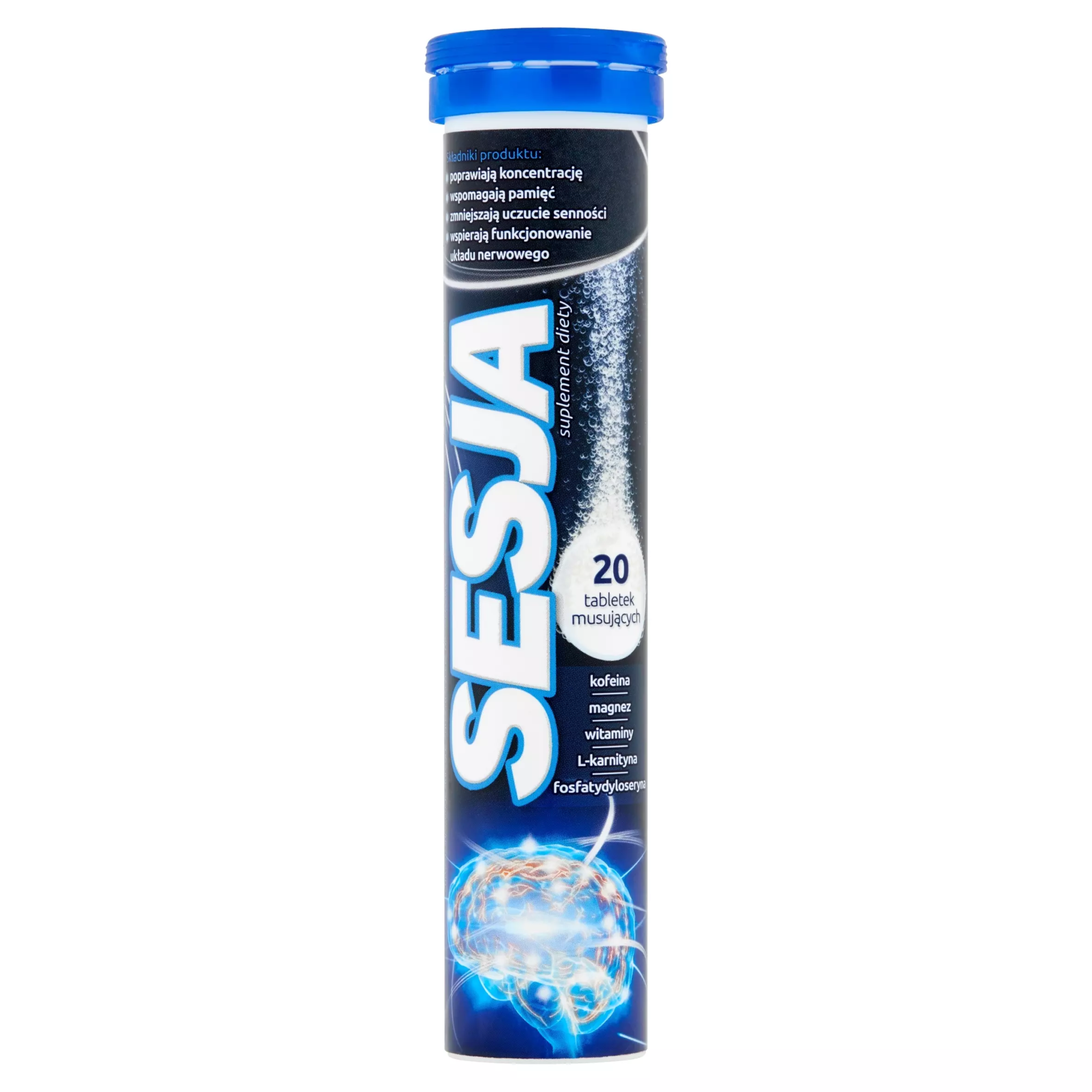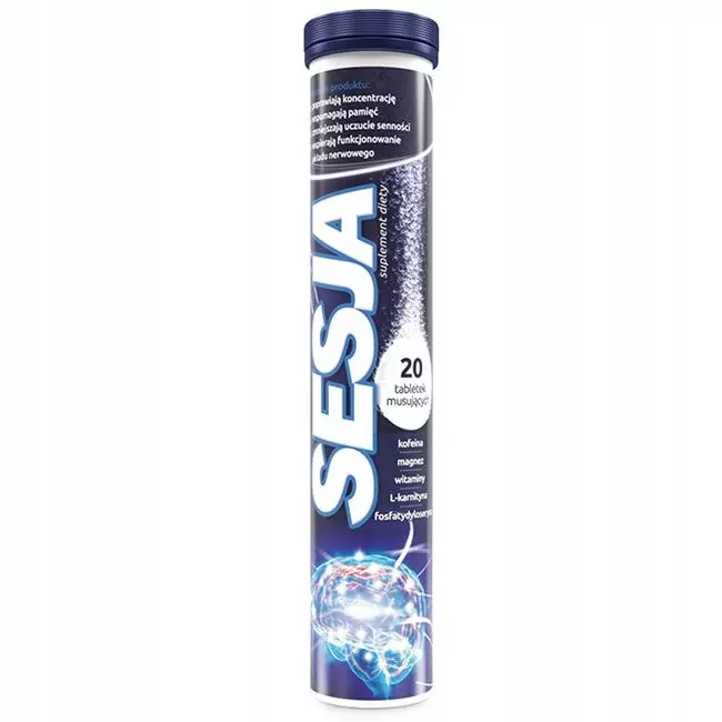 Suplement diety Sesja dla młodzieży oraz dorosłych, przeznaczony do wspomagania układu nerwowego np. podczas intensywnej pracy umysłowej. Zawiera m.in. pobudzającą kofeinę czy wspierający w zachowaniu równowagi elektrolitowej magnez.