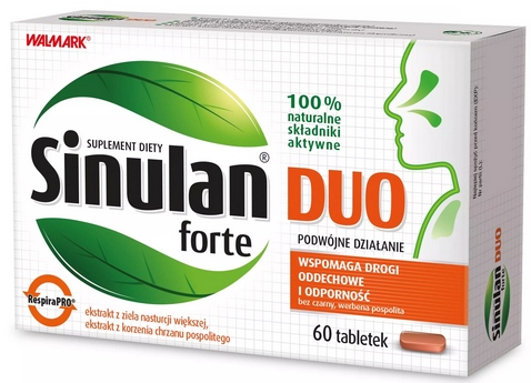 Sinulan Duo Forte to suplement diety zawierający kompozycję ekstraktów roślinnych, które wykazują korzystne, dwutorowe działanie wspomagające funkcjonowanie dróg oddechowych oraz układu odpornościowego.