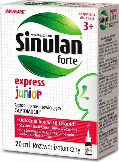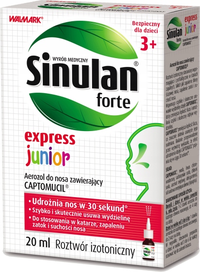 SINULAN Express Forte Junior to aerozol do nosa zawierający CAPTOMUCIL w postaci roztworu izotonicznego, stosowany jest wspomagająco w stanach zapalnych, takich jak zapalenie błony śluzowej nosa, zapalenie zatok oraz w przypadku kataru lub suchości nosa. Wspomaga szybkie i skuteczne usuwanie wydzieliny dzięki Captomucil, który zmniejsza lepkość śluzu i umożliwia szybkie i skuteczne usunięcie wydzieliny.