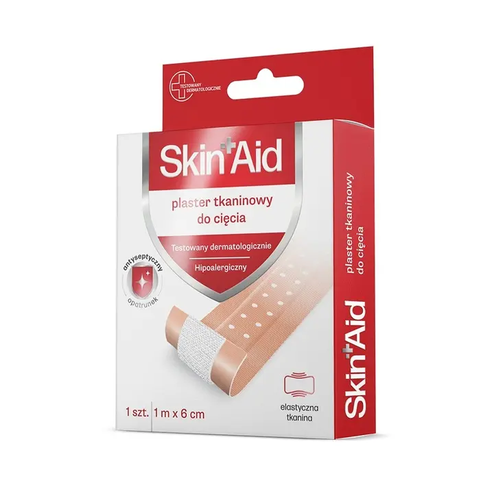 Plaster tkaninowy do cięcia o wymiarach 1 m x 6 cm z antyseptycznym opatrunkiem z dodatkiem 0,3% chlorheksydyny, o działaniu pomocniczym, zapobiega i zwalcza infekcje kontrolując mikrośrodowisko rany.