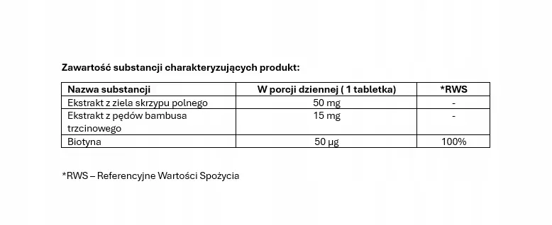 Ekstrakt suchy z ziela Skrzypu polnego 50 mg, ekstrakt suchy z pędów bambusa 15 mg, biotyna 5μg.