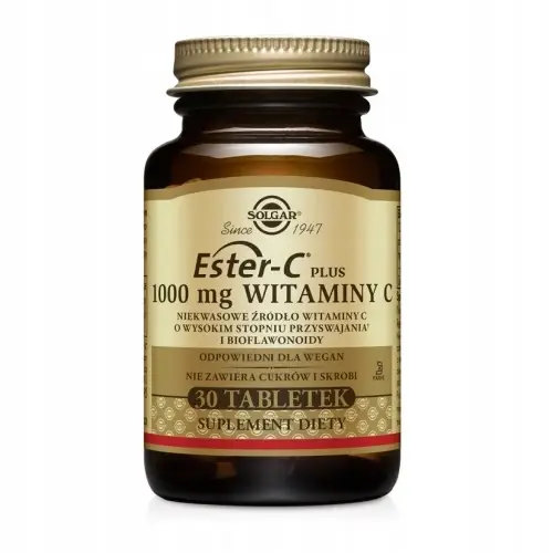 SOLGAR Ester-C Plus Witamina C to zaawansowany suplement diety, który dostarcza organizmowi witaminę C w formie Ester-C® - innowacyjnej, niekwaśnej formy witaminy C. Ten produkt jest szczególnie polecany osobom, które chcą wspierać swoje zdrowie układu odpornościowego, zdrowie skóry, a także ogólną kondycję organizmu. Dzięki swojej unikalnej formule, Ester-C® jest łagodny dla żołądka i zapewnia dłuższe utrzymanie się witaminy C w organizmie, co pozwala na bardziej efektywne wykorzystanie tego kluczowego składnika. Składniki aktywne i ich właściwości: ✔️Ester-C - to opatentowana forma witaminy C, która jest buforowana, co oznacza, że jest mniej kwaśna niż tradycyjny kwas askorbinowy. Dzięki temu jest łagodniejsza dla żołądka i bardziej odpowiednia dla osób z wrażliwym układem pokarmowym. Witamina C jest kluczowym antyoksydantem, który wspiera układ odpornościowy, chroni komórki przed stresem oksydacyjnym oraz wspomaga produkcję kolagenu, niezbędnego dla zdrowia skóry, chrząstek i naczyń krwionośnych. ✔️Kompleks bioflawonoidów cytrusowych - wspierają działanie witaminy C, zwiększając jej biodostępność oraz wzmacniając działanie antyoksydacyjne. Wspierają zdrowie naczyń krwionośnych oraz działają przeciwzapalnie. ✔️Rutozyd - znany również jako rutyna, to flawonoid, który wspiera zdrowie naczyń krwionośnych, wzmacniając ich ściany i poprawiając elastyczność. Wspomaga również działanie witaminy C, potęgując jej korzystny wpływ na organizm. ✔️Acerola i dzika róża - naturalne źródła witaminy C dodatkowo wspierają jej działanie, dostarczając cennych składników odżywczych i antyoksydantów, które wspomagają zdrowie układu odpornościowego oraz wspierają ochronę komórek przed stresem oksydacyjnym. SOLGAR Ester C-Plus witamina C (1000 mg) 30 tabletek suplement na odporność Korzyści: ⭐Wsparcie układu odpornościowego: Ester-C wspiera naturalne mechanizmy obronne organizmu, pomagając w ochronie przed infekcjami i chorobami, zwłaszcza w okresach zwiększonego ryzyka zachorowań. ⭐Łagodny dla żołądka: Dzięki swojej buforowanej formie, Ester-C jest mniej kwaśny i bardziej przyjazny dla żołądka, co czyni go idealnym wyborem dla osób z wrażliwym układem pokarmowym. ⭐Wsparcie zdrowia skóry i stawów: Witamina C wspomaga produkcję kolagenu, kluczowego dla zdrowej, elastycznej skóry oraz mocnych stawów i naczyń krwionośnych. SOLGAR Ester C-Plus witamina C (1000 mg) 30 tabletek suplement na odporność Postać tabletki ❓Jak stosować❓ Osoby dorosłe 1 tabletka dziennie, najlepiej w trakcie posiłku lub według wskazań lekarza. Nie przekraczać porcji zalecanej do spożycia w ciągu dnia. Suplement diety nie jest substytutem zróżnicowanej diety. Zrównoważona dieta oraz zdrowy tryb życia są ważne. Przechowywać w miejscu suchym, ciemnym, w sposób niedostępny dla małych dzieci. Kobiety w ciąży, matki karmiące oraz osoby zażywające leki lub chore powinny przed zażyciem skonsultować się z lekarzem. Nie stosować u osób mających predyspozycje do tworzenia kamieni nerkowych lub chorujących na kamicę nerkową. Zawartość w 1 tabletce: Witamina C (L-askorbinian wapnia, Ester-C) – 1000 mg Bioflawonoidy cytrusowe – kompleks – 200 mg Rutyna – 25 mg Dzika róża – sproszkowane owoce – 25 mg Acerola – sproszkowany wyciąg z owoców (4:1) – 25 mg Składniki: Witamina C (L-askorbinian wapnia, Ester-C®), bioflawonoidy cytrusowe – kompleks, substancja wypełniająca: celuloza, substancje przeciwzbrylające: dwutlenek krzemu, (roślinne) kwasy tłuszczowe; substancje wypełniające: guma celulozowa, fosforany wapnia, hydroksypropyloceluloza; rutyna, dzika róża – sproszkowane owoce, acerola- sproszkowany wyciąg z owoców, substancja glazurująca: hydroksypropylometyloceluloza, substancja przeciwzbrylająca: sole magnezowe (roślinnych) kwasów tłuszczowych, substancja glazurująca: glicerol (roślinny).