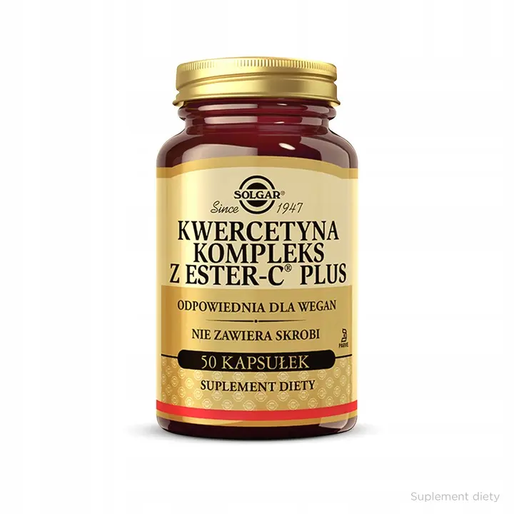 Zdrowie naszego organizmu zależy m.in. od odpowiednio funkcjonującego układu odpornościowego. Jego osłabienie sprzyja nie tylko infekcjom, takim jak przeziębienie, ale i wielu innym schorzeniom. Kluczowe znaczenie we wsparciu odporności odgrywa zróżnicowana dieta, w której nie powinno zabraknąć m.in. witaminy C. Składnik ten pomaga w prawidłowej pracy układu odpornościowego. W trosce o jego uzupełnienie, a tym samym wsparcie odporności, wypróbuj suplement na odporność Solgar Kwercetyna Kompleks z Ester-C Plus. Co wyróżnia Solgar formułę Kwercetyna Kompleks z Ester-C Plus w kapsułkach To unikalny kompleks kwercetyny ze specjalną formą witaminy C o przedłużonym działaniu, która szybciej się wchłania, niż zwykła witamina C. Ester-C to postać witaminy C opatentowana i przebadana naukowo. Produkt ten z pewnością docenią osoby poszukujące formy witaminy C łagodnej dla żołądka. Postaw na całodobowe wsparcie odporności z Solgar! Suplement diety Solgar Kwercetyna Kompleks witamina C kapsułki 50 szt. Postać tabletki Wymagania dietetyczne: Kompozycja wzbogacona dodatkiem bioflawonoidów z owoców cytrusowych i rutyny Bez sztucznych aromatów i barwników Bez substancji słodzących i konserwujących Nie zawiera pszenicy, produktów mlecznych, soi, drożdży i skrobi Produkt bezglutenowy Odpowiedni dla wegan Jak Spożywać: Osoby dorosłe jedną (1) kapsułkę dziennie, najlepiej w trakcie posiłku lub według wskazań lekarza. Nie należy przekraczać zalecanej porcji do spożycia w ciągu dnia. Suplement diety Solgar Kwercetyna Kompleks witamina C kapsułki 50 szt. Marka Solgar Nasza misja Marka Solgar® to wynik ponad 75 lat zaangażowania w jakość, zdrowie i dobrostan. Nasza misja przez dziesięciolecia pozostaje taka sama: tworzenie najlepszych suplementów diety, co jest możliwe dzięki nieustannym badaniom nad tworzeniem produktów z najlepszych dostępnych surowców. Jeśli chodzi o jakość, Solgar® to Złoty Standard. Każdego dnia dostarczamy Złoty Standard Formuły poparte naukowo Składniki najwyższej jakości Ciągłe dążenie do odważnych innowacji Butelki ze szkła bursztynowego nadające się do recyklingu Tworzenie tego, czego ludzie potrzebują, a nie tylko tego, co jest modne Odpowiedzialność wobec naszych partnerów i konsumentów Unikanie stosowania sztucznych składników lub wypełniaczy Własny instytut badawczy i fabryka Najwyższe standardy jakości: filtracja wody zgodna z farmakopeą, filtracja powietrza HEPA Suplement diety Solgar Kwercetyna Kompleks witamina C kapsułki 50 szt. Nazwa Kwercetyna Kompleks SKŁADNIKI: Witamina C (Ester-C®, L-askorbinian wapnia), kwercetyna, otoczka kapsułki roślinnej (hydroksypropylometyloceluloza), substancje przeciwzbrylające (sole magnezowe kwasów tłuszczowych (roślinnych), dwutlenek krzemu, kwasy tłuszczowe (roślinne)), bromelaina, kompleks bioflawonoidów cytrusowych, sproszkowane owoce dzikiej róży (Rosa canina), sproszkowany wyciąg z owoców aceroli (4:1) (Malpighia glabra), substancja wypełniająca (celuloza mikrokrystaliczna), rutyna. SPOSÓB UŻYCIA: Osoby dorosłe jedną (1) kapsułkę dziennie, najlepiej w trakcie posiłku lub według wskazań lekarza. Nie należy przekraczać zalecanej porcji do spożycia w ciągu dnia. OSTRZEŻENIA: Przechowywać w temperaturze pokojowej, w miejscu suchym, ciemnym i w sposób niedostępny dla małych dzieci. Nie używać, jeżeli zewnętrzna folia została usunięta lub uszkodzona w inny sposób, umożliwiający otwarcie produktu przed zakupem.