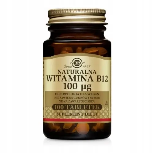 SOLGAR Witamina B12 (100 µg w 1 tabletce) to suplement diety dostarczający wysoką dawkę witaminy B12, znanej również jako kobalamina. Witamina ta odgrywa kluczową rolę w wielu procesach metabolicznych organizmu, zwłaszcza tych związanych z układem nerwowym i krwiotwórczym. Jest niezbędna do produkcji czerwonych krwinek, wspomaga funkcjonowanie układu nerwowego, a także bierze udział w metabolizmie homocysteiny, co jest ważne dla zdrowia serca. Jak działa witamina B12? Witamina B12 wspiera prawidłowe funkcjonowanie układu nerwowego, pomaga w produkcji DNA oraz czerwonych krwinek, co zapobiega anemii megaloblastycznej, która może prowadzić do osłabienia i zmęczenia. Kobalamina jest również kluczowa dla metabolizmu energetycznego i może wspierać funkcje poznawcze oraz nastrój. Ponadto, witamina B12 jest istotna w redukcji poziomu homocysteiny, co ma pozytywny wpływ na zdrowie układu sercowo-naczyniowego. SOLGAR Witamina B12 100 tabletek kobalamina suplement diety na ból głowy Korzyści: ✔️Wsparcie układu nerwowego: Witamina B12 odgrywa kluczową rolę w utrzymaniu zdrowego funkcjonowania układu nerwowego, wspierając regenerację osłonek mielinowych oraz syntezę neuroprzekaźników. ✔️Produkcja czerwonych krwinek: Suplementacja witaminą B12 pomaga zapobiegać anemii, wspierając produkcję zdrowych czerwonych krwinek i transport tlenu w organizmie. ✔️Wsparcie metabolizmu energetycznego: Witamina B12 bierze udział w metabolizmie białek, tłuszczów i węglowodanów, co przyczynia się do prawidłowego metabolizmu energetycznego. ✔️Redukcja poziomu homocysteiny: Wspieranie metabolizmu homocysteiny może przyczynić się do poprawy zdrowia serca, redukując ryzyko chorób układu krążenia. SOLGAR Witamina B12 100 tabletek kobalamina suplement diety na ból głowy Kod producenta 033984031807 ❓Jak stosować❓ Osoby dorosłe 1 tabletka dziennie, najlepiej w trakcie posiłku lub według wskazań lekarza. Nie przekraczać porcji zalecanej do spożycia w ciągu dnia. Nie spożywać innych suplementów diety zawierających witaminę B12. Suplementu diety nie należy stosować zamiast zróżnicowanej, zbilansowanej diety i zdrowego stylu życia. Przechowywać w temperaturze pokojowej, w miejscu suchym, ciemnym, w sposób niedostępny dla małych dzieci. Składniki: substancje wypełniające (celuloza mikrokrystaliczna, fosforany wapnia, mannitol), substancje przeciwzbrylające (kwasy tłuszczowe, dwutlenek krzemu, sole magnezowe (roślinnych) kwasów tłuszczowych), stabilizator (guma celulozowa), witamina B12 (cyjanokobalamina).