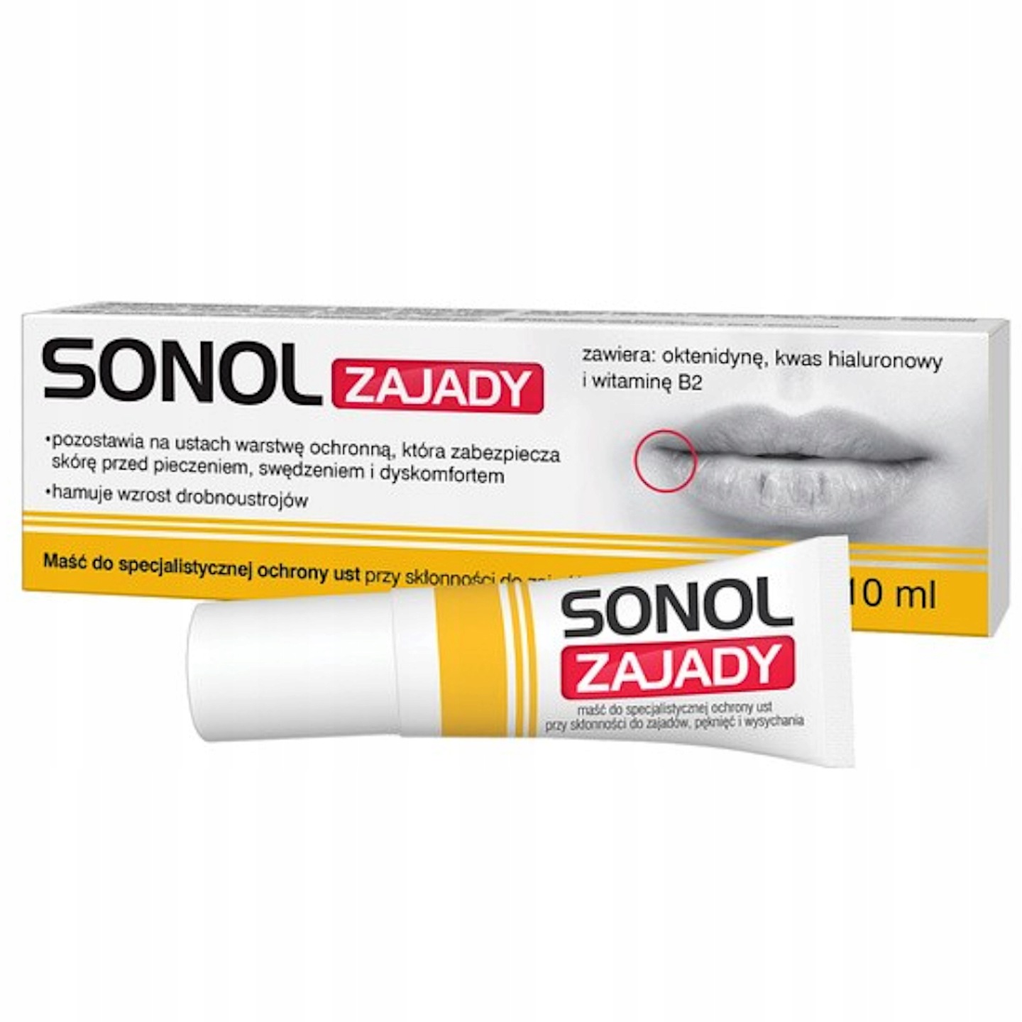 Sonol Zajady to maść do pielęgnacji i ochrony skóry ust u osób ze skłonnością do powstawania zajadów, pęknięć i wysychania skóry ust.