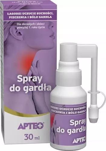 Dzięki obecności składników powlekających błonę śluzową jamy ustnej i gardła Spray do gardła APTEO łagodzi uczucie suchości, pieczenia i bólu gardła, zwłaszcza w czasie przełykania.