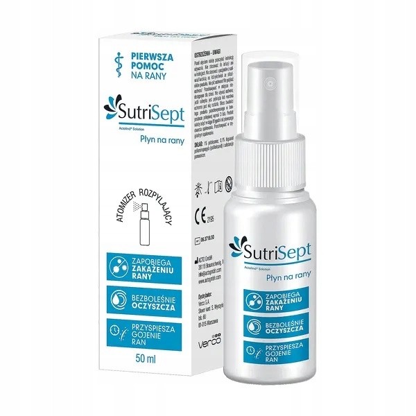 SutriSept Płyn na rany przeznaczony jest do oczyszczania, irygacji oraz nawilżania ran i oparzeń 1. i 2. stopnia. Dzięki unikalnej kompozycji składników działa oczyszczająco oraz przyspiesza gojenie rany. Płyn izoluje powierzchnię rany od środowiska zewnętrznego, tworząc powłokę ochronną. Przeciwdrobnoustrojowe właściwości płynu zapobiegają tworzeniu się biolilmu bakteryjnego. Płyn powoduje także trwały ełekt nawilżenia. Utrzymanie czystości i wilgotności rany zapewnia stabilne środowisko w ranie.