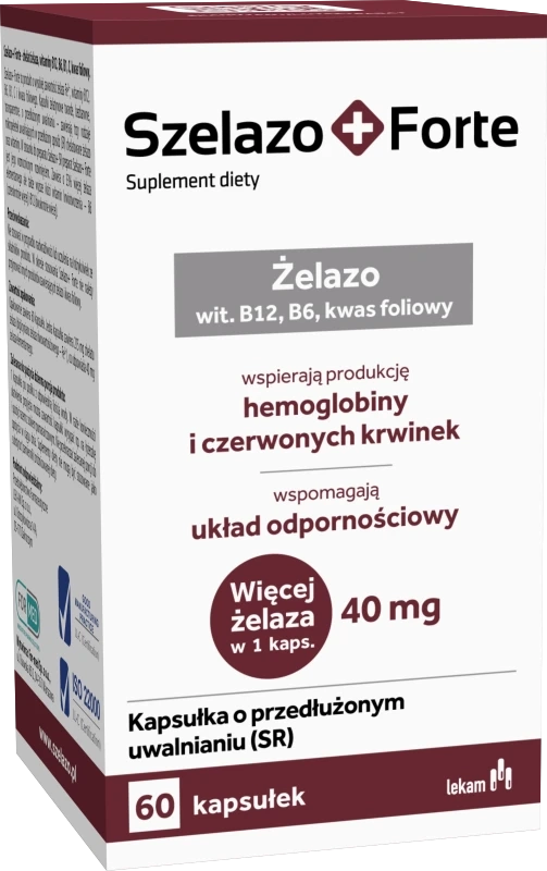 OPIS Szelazo + Forte to suplement diety w postaci kapsułek o przedłużonym uwalnianiu zawierający żelazo, witaminy B12, B6 i kwas foliowy. KApsułki żelatynowe twarde, bezbarwne, transparentne, o przedłuzonym uwalnianiu - zawierają trzy rodzaje mikropeletek uwalniających w przedłuzony sposób (SR) chelatowane żelazo oraz witaminy. Produkt przeznaczony dla osób dorosłych. MASA NETTO 54 g (60 kapsułek o przedłużonym uwalnianiu) INFORMACJE DOTYCZĄCE BEZPIECZEŃSTWA Nie przekraczać zalecanej dziennej porcji do spożycia. Suplement diety nie może być stosowany jako substytut (zamiennik) zróżnicowanej diety. Dla zdrowia ważna jest zróżnicowana dieta oraz zdrowy tryb życia. Przechowywać w miejscu niedostępnym dla dzieci. Nie należy stosować preparatu w przypadku nadwrażliwości na którykolwiek składnik preparatu. Nie należy spożywać po upływie daty minimalnej trwałości.