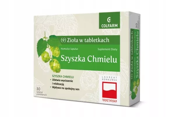 Szyszka chmielu to suplement diety, który zmniejsza objawy napięcia nerwowego. Wyciąg z szyszki chmielu działa uspokajająco i pomaga w zasypianiu. Dodatkowo chroni przed wolnymi rodnikami, reguluje poziom cholesterolu we krwi i wpływa korzystnie na trawienie.
