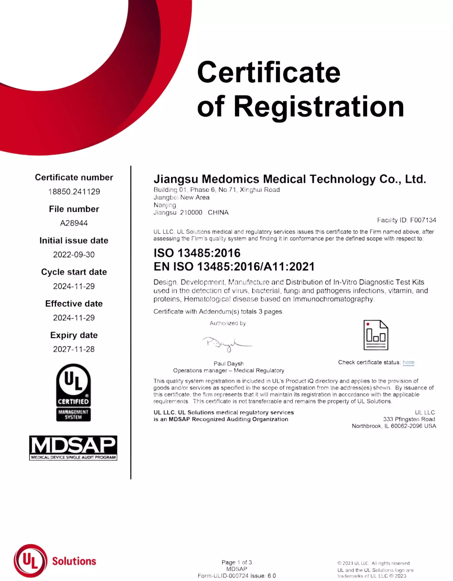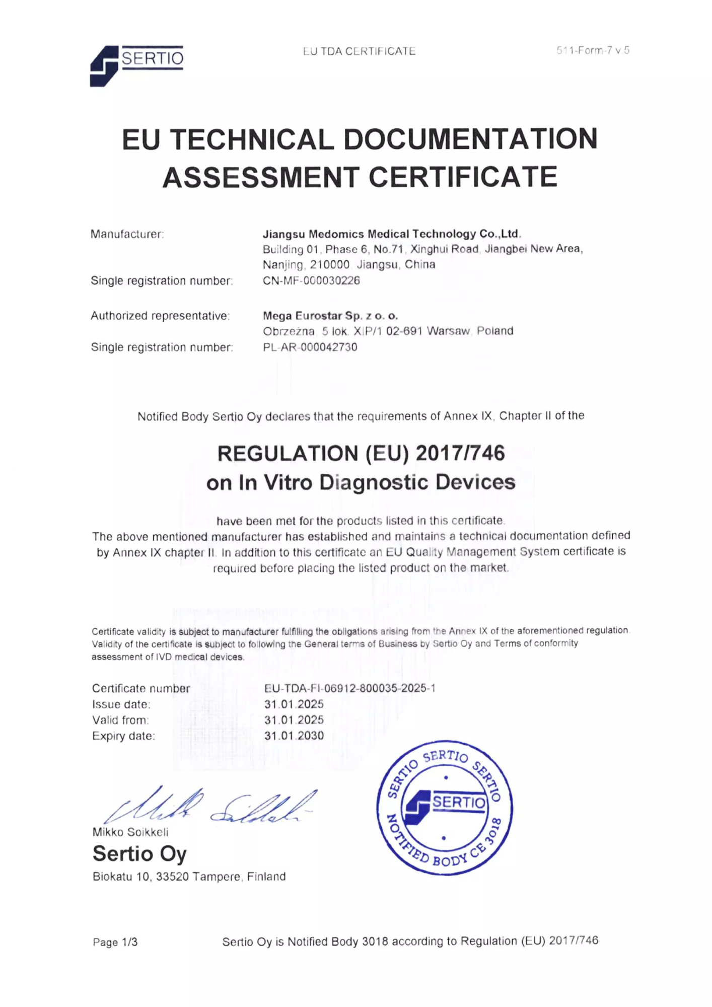 Test 5w1 Medomics przeszedł procedurę oceny zgodności przeprowadzoną zgodnie z nowymi przepisami IVDR (In Vitro Diagnostic Medical Devices Regulation). Test posiada certyfikat CE ważny do 2030 roku, co potwierdza jego zgodność z europejskimi standardami bezpieczeństwa i skuteczności.