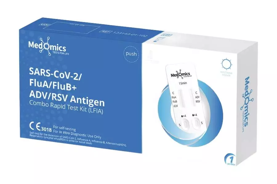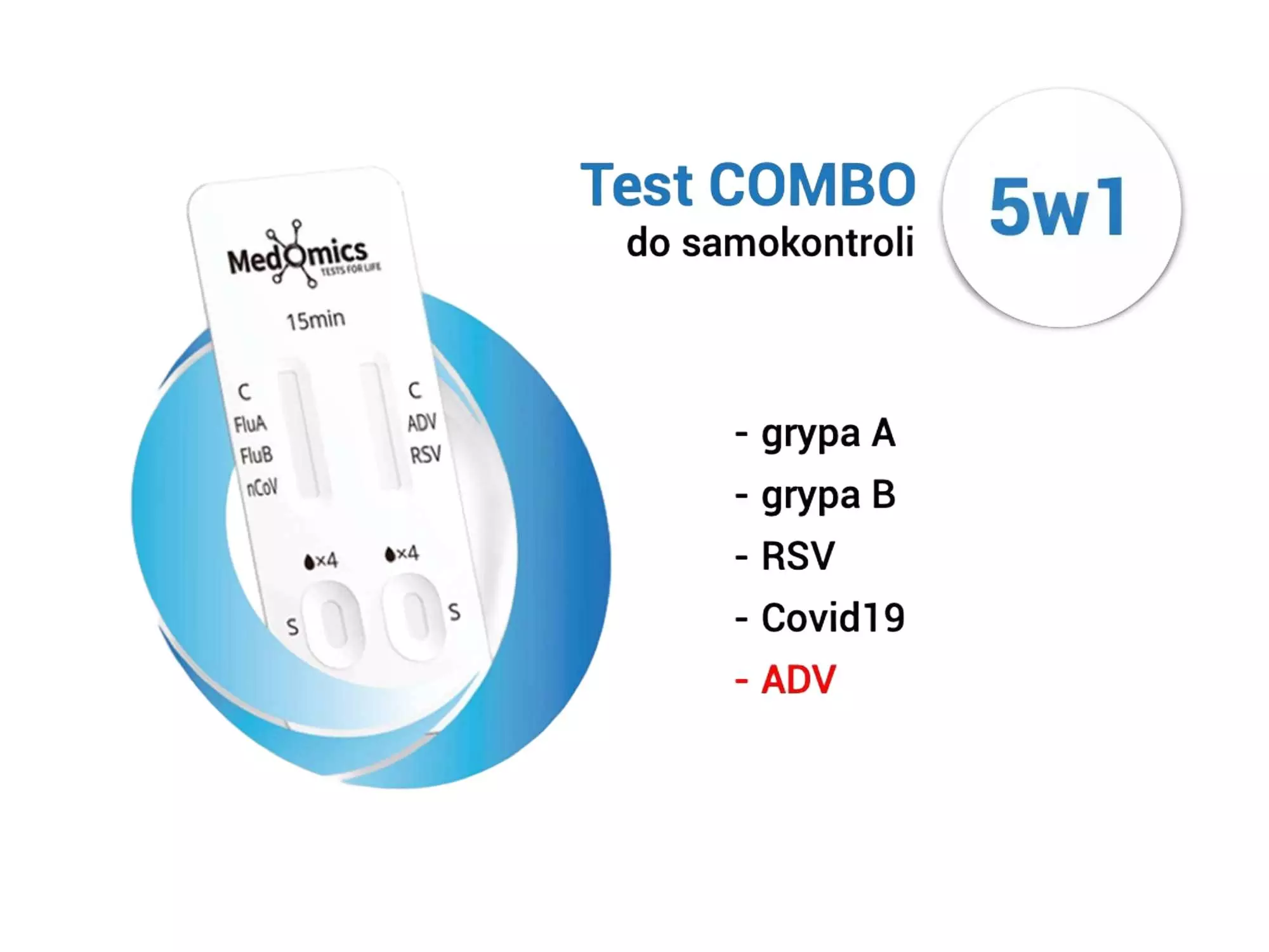 Test Combo 5w1 Medomics to nowoczesne narzędzie diagnostyczne umożliwiające jednoczesne wykrywanie pięciu najczęstszych patogenów układu oddechowego: