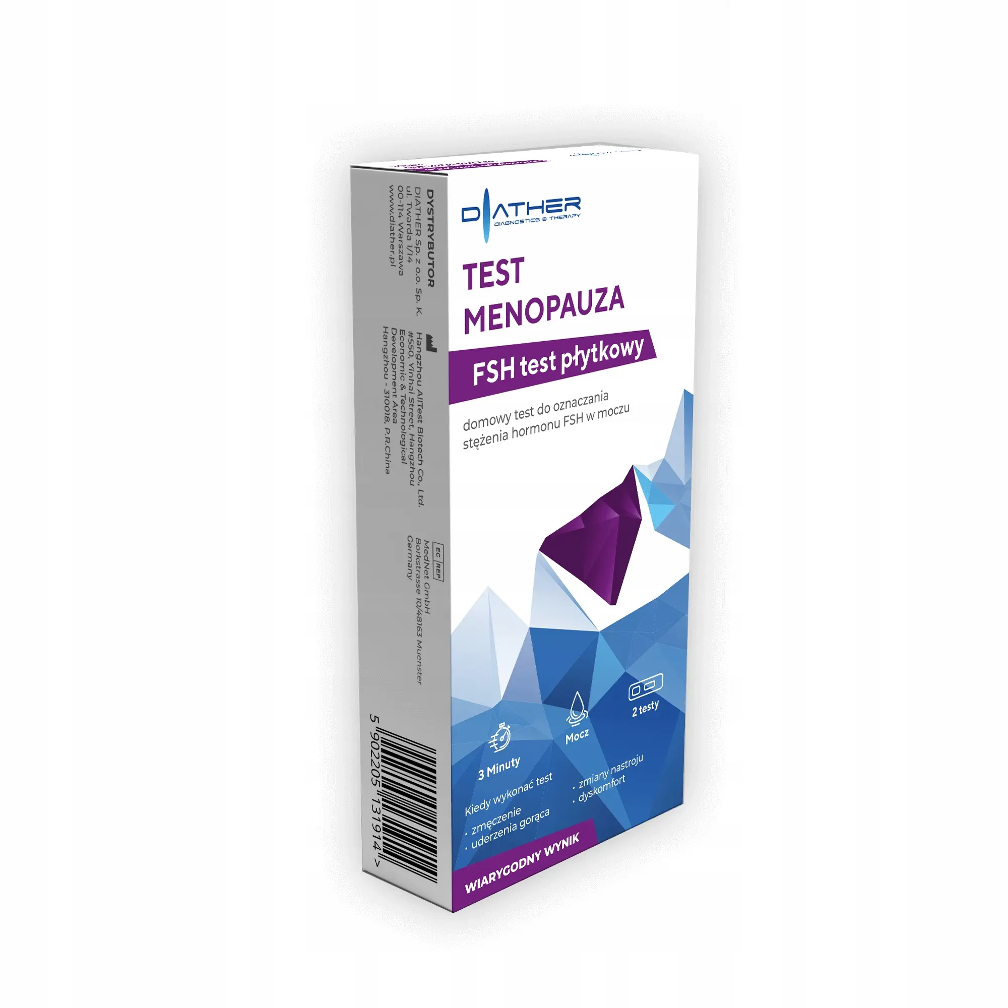 Diather Test Kasetkowy Menopauza to szybki, domowy test do samodzielnego oznaczania stężenia hormonu folikulotropowego (FSH) w moczu. Test ten jest przeznaczony do wykrywania FSH o stężeniu 25 mlU/ml lub wyższym, co pozwala na ocenę, czy kobieta jest w okresie perimenopauzalnym.