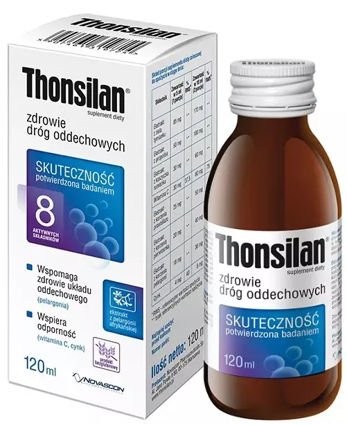 Thonsilan to innowacyjny suplement diety przeznaczony dla dzieci od 3. roku życia o malinowym smaku z dodatkiem soku z aronii.