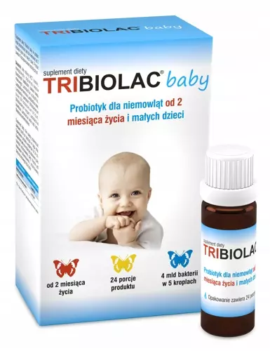 ma postać kropli. Przeznaczony jest dla niemowląt od 2 miesiąca życia oraz małych dzieci. Preparat nie wymaga przechowywania w lodówce. Zawiera 10 szczepów bakterii probiotycznych. Tribiolac baby polecany jest w celu: skrócenia czasu trwania biegunki oraz przywrócenia równowagi flory bakteryjnej przewodu pokarmowego, zwłaszcza w trakcie lub po antybiotykoterapii.