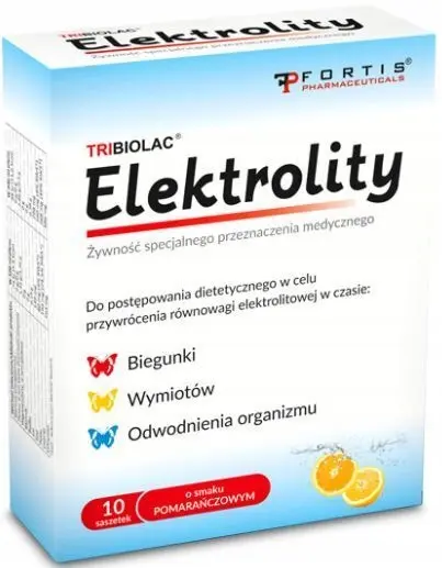 Doustny płyn nawadniający o zmniejszonej osmolarności 209 mOsm/l stosowany w celu przywrócenia równowagi elektrolitowej w czasie biegunki, wymiotów oraz do zapobiegania odwodnieniu organizmu. Tribiolac ELEKTROLITY uzupełnia płyny i składniki mineralne w przypadku zaburzeń gospodarki wodno-elektrolitowej oraz zapobiega odwodnieniu. Saszetki o smaku pomarańczowym dla dzieci od 3 roku życia oraz dorosłych.