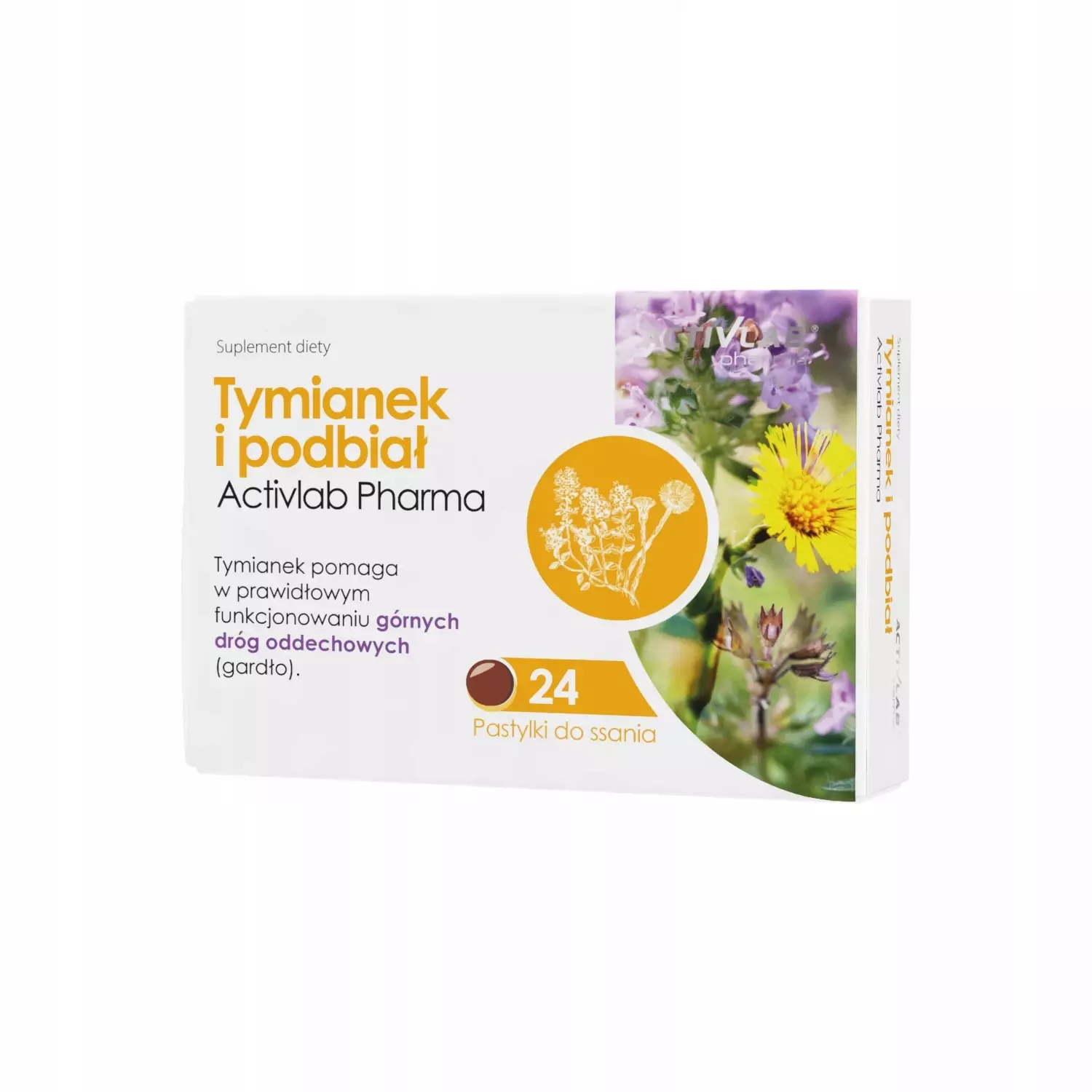 Tymianek i podbiał Activlab Pharma - pastylki do ssania z wyciągami ziołowymi. W składzie produktu znajdują się ekstrakt z liści podbiału (Tussilago farfaraL.), ekstrakt z ziela tymianku (Thymus vulgarisL.). Smak produktu dodatkowo wzbogaca ekstrakt z 20 ziół.