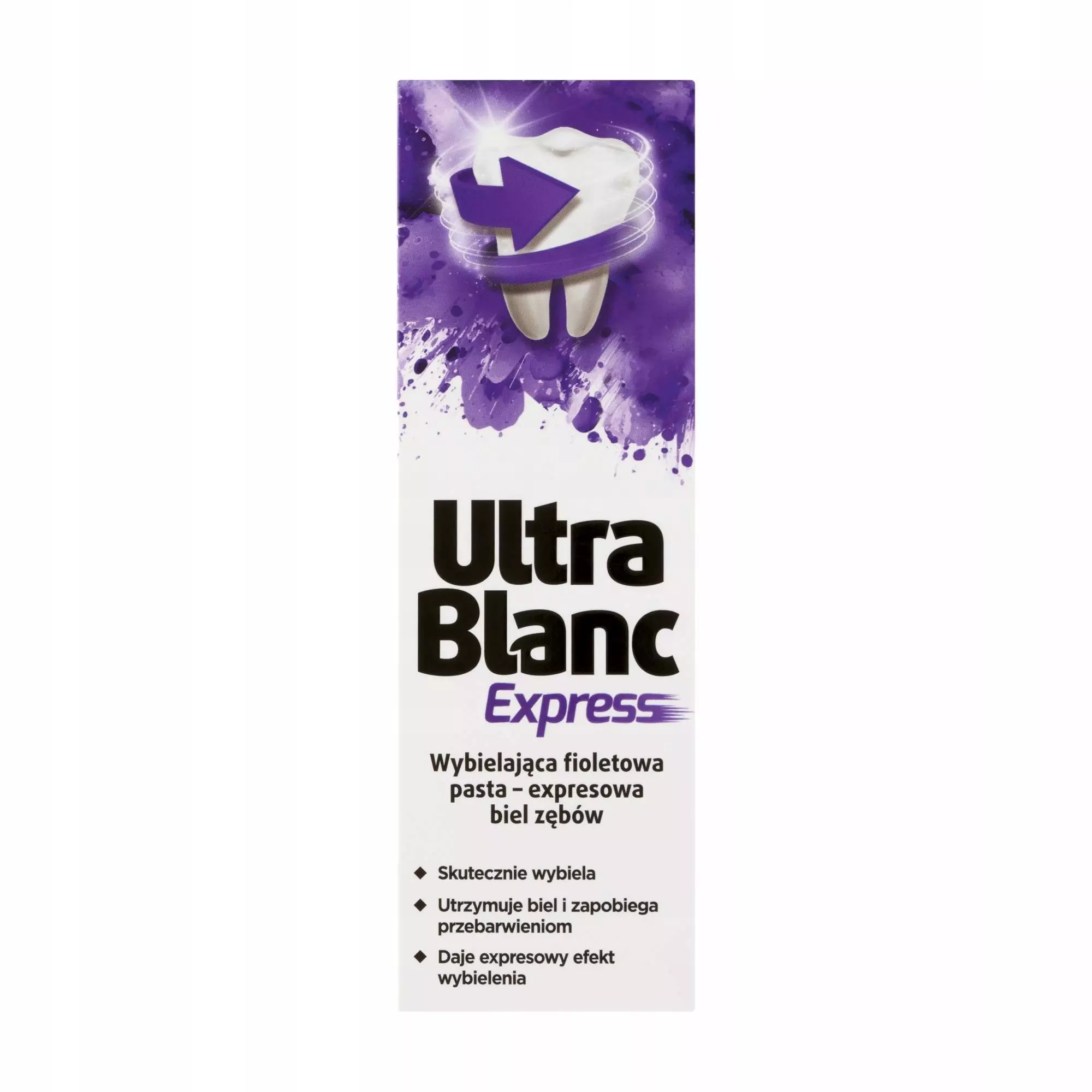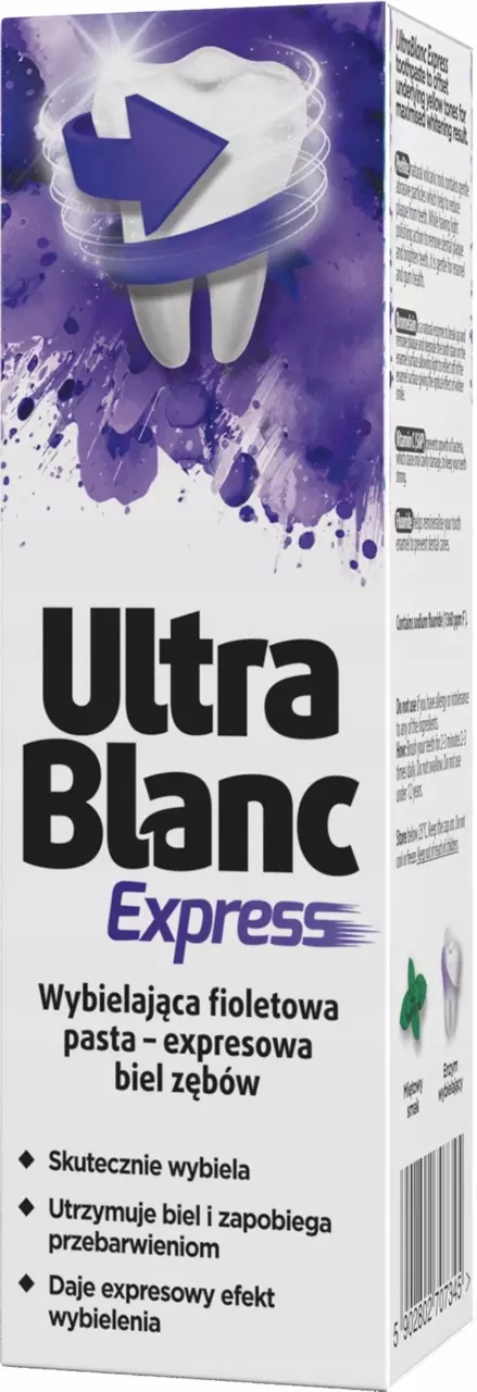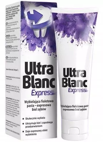 UltraBlanc Express to wybielająca pasta do zębów opracowana z myślą o codziennym myciu zębów, na których widoczne są przebarwienia. Pasta zapewnia zębom efekt expresowego wybielenia, jej fioletowy kolor optycznie rozjaśnia zęby oraz niweluje żółte przebarwienia. Produkt usuwa odbarwienia powstałe na skutek codziennego picia kawy czy herbaty. Pasta przywraca biel zębów i zapewnia piękny, biały uśmiech!